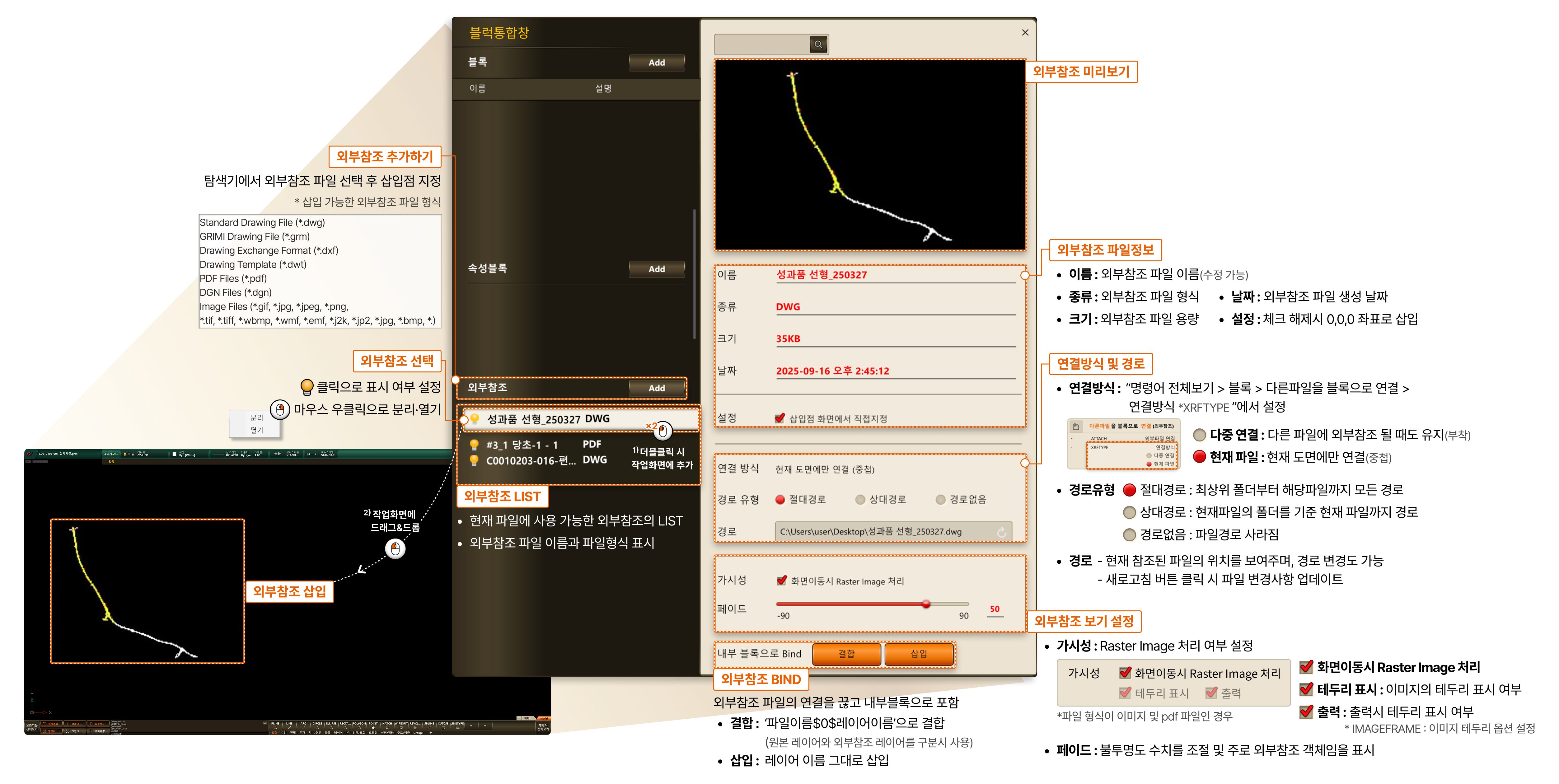현재 작업파일에 다른 파일을 연결하여 외부참조를 생성하고 관리