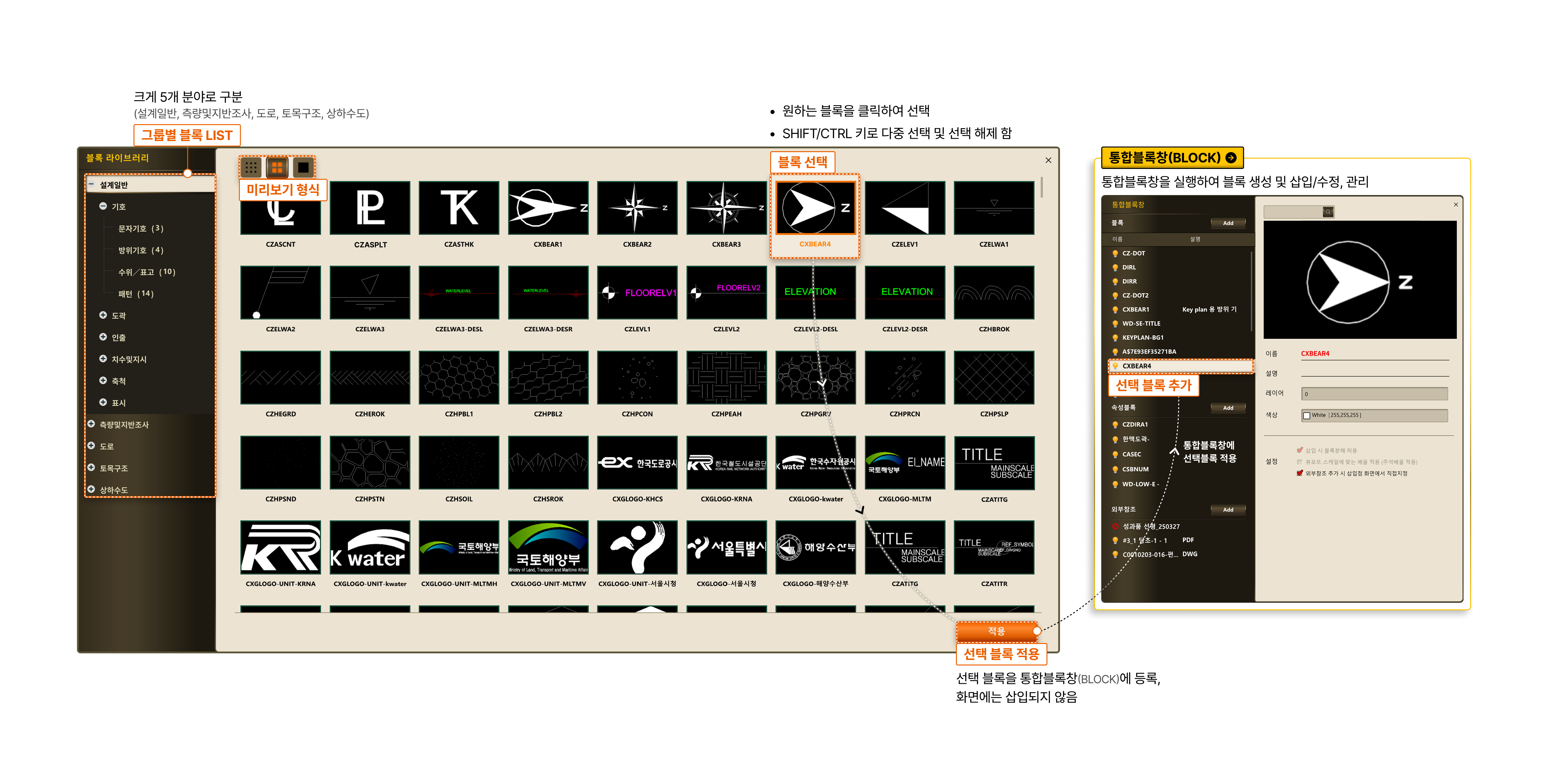 - 통합블록창(BLOCK) 통합블록창을 실행하여 블록 생성 및 삽입/수정, 관리