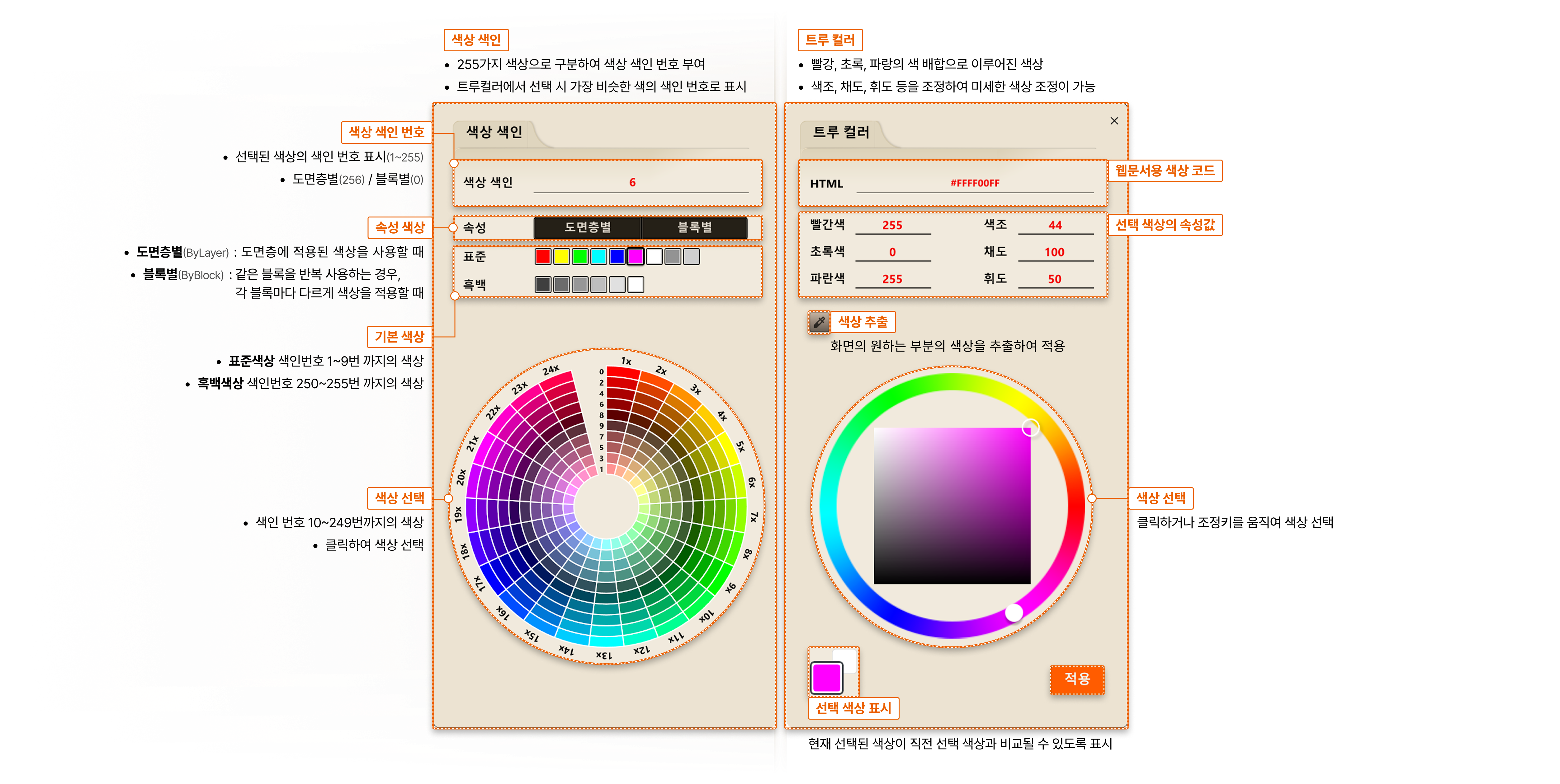 적용할 색상을 선택하고 선택 색상에 대한 속성 값 확인