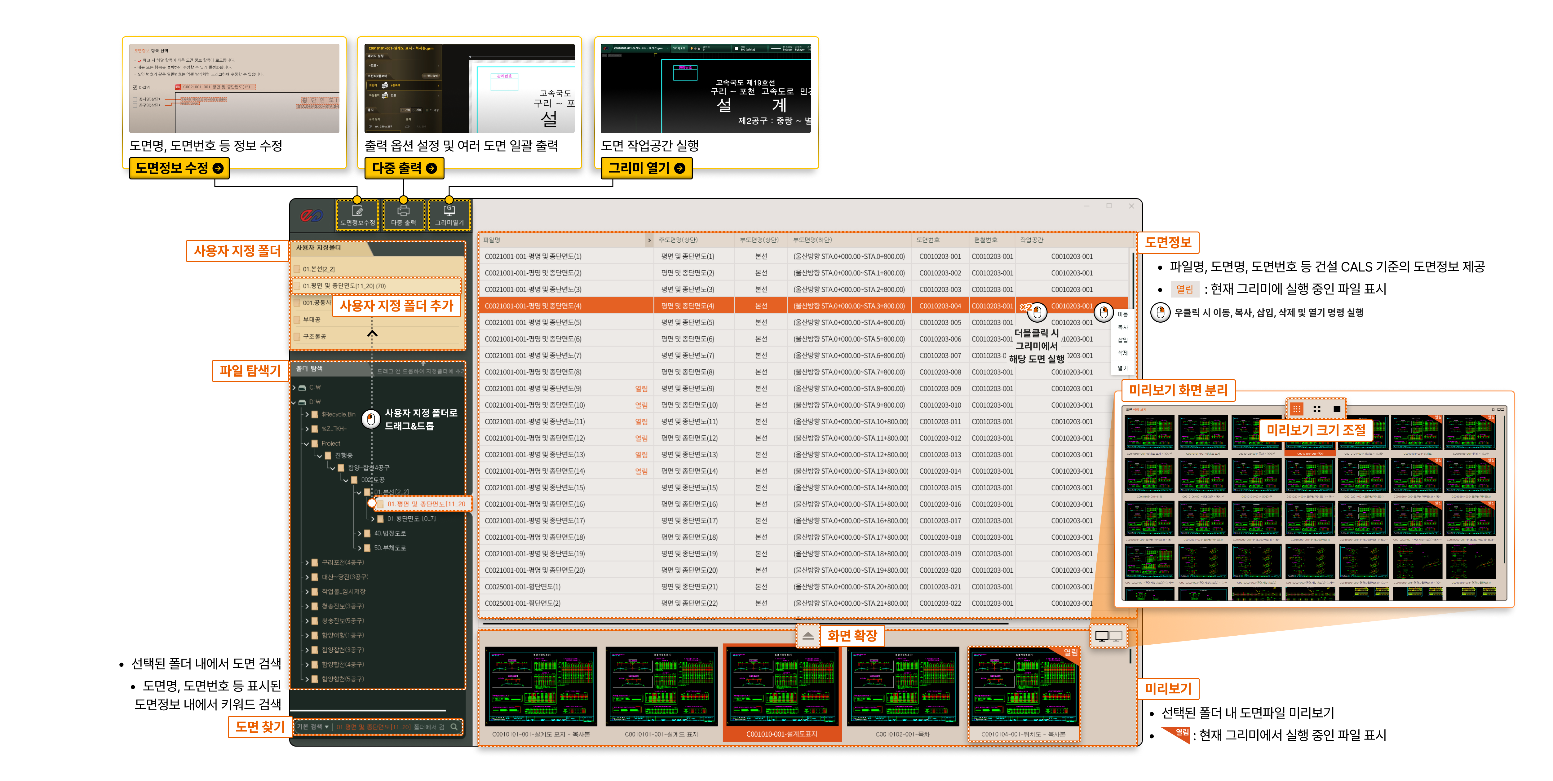 선택된 폴더 내의 도면 파일을 한 눈에 보면서 탐색하고 정보 열람이 가능