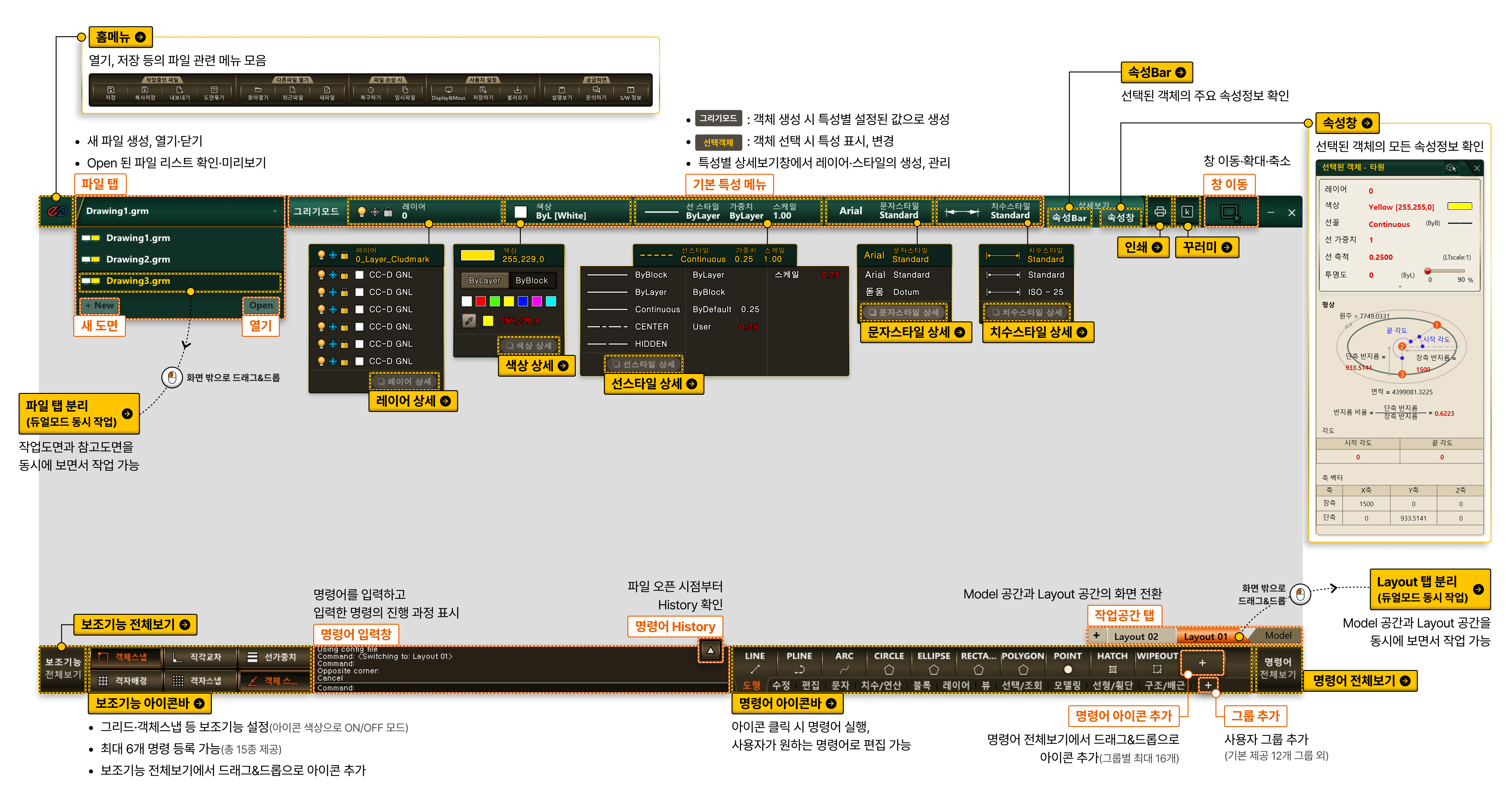 - 그리드·객체스냅 등 보조기능 설정(아이콘 색상으로 ON/OFF 모드)