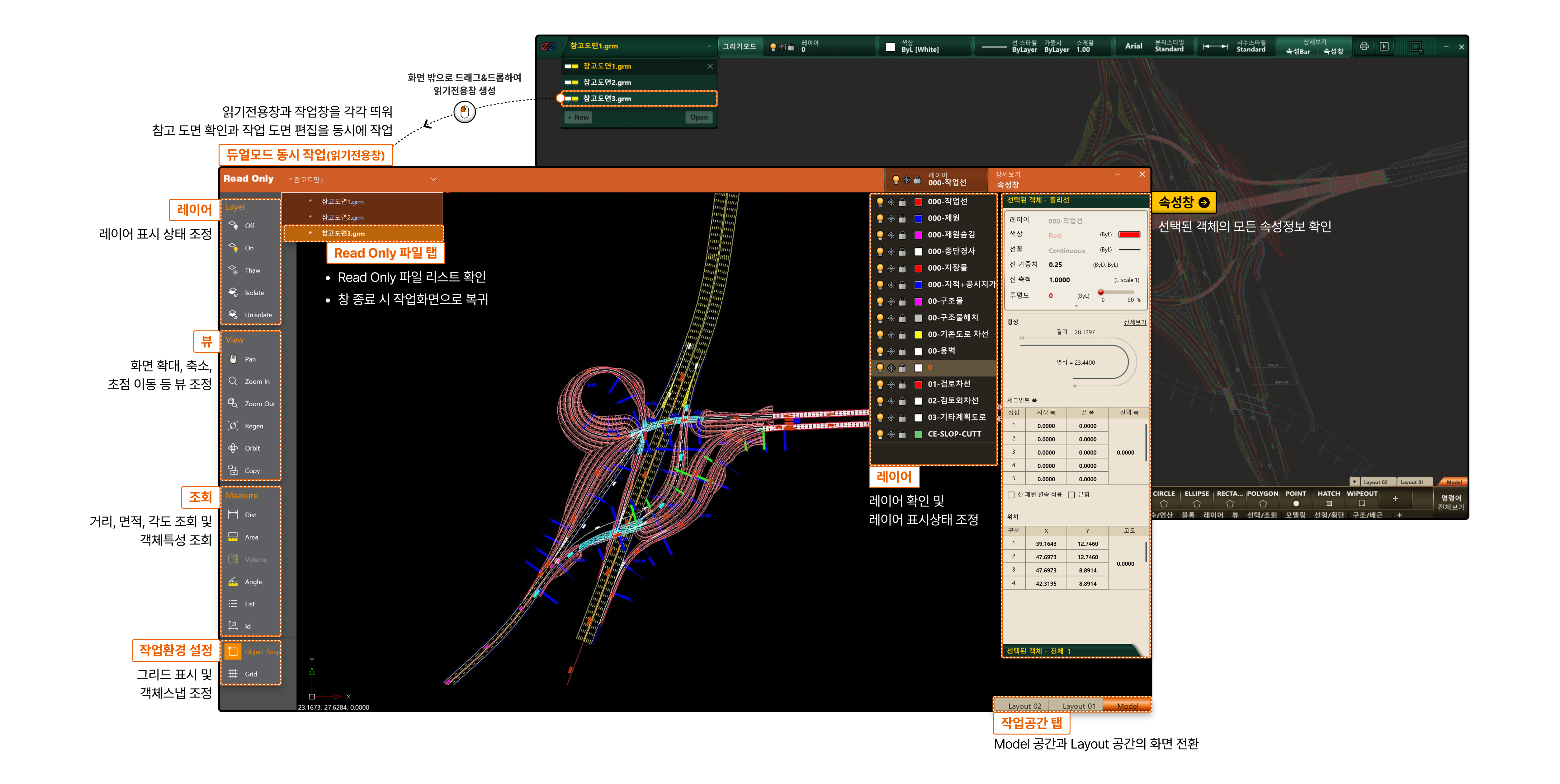 - 읽기전용창과 작업창을 각각 띄워 참고 도면 확인과 작업 도면 편집을 동시에 작업