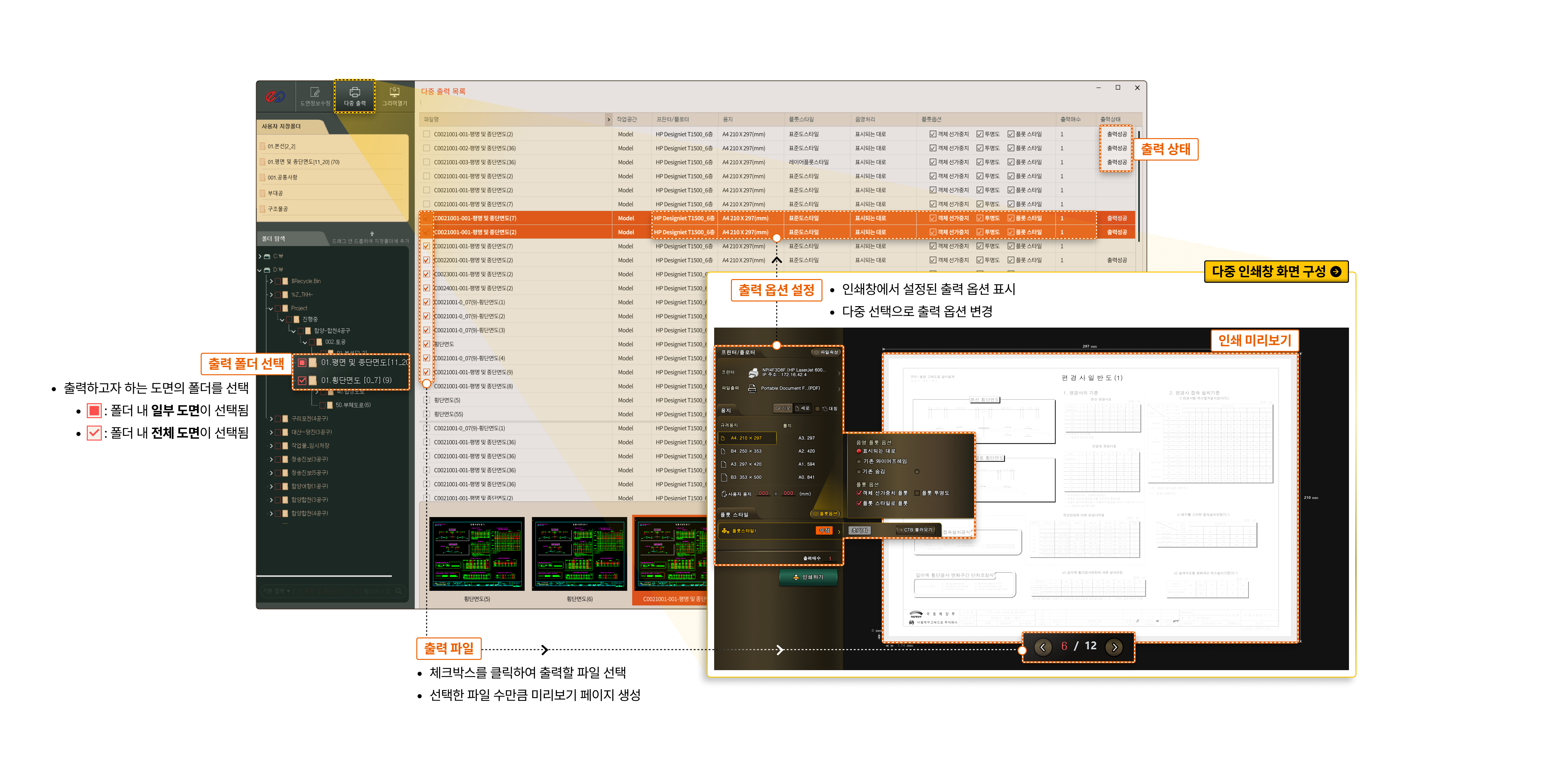 도면파일을 폴더 단위 및 개별선택하여 옵션 설정 및 다중출력 가능