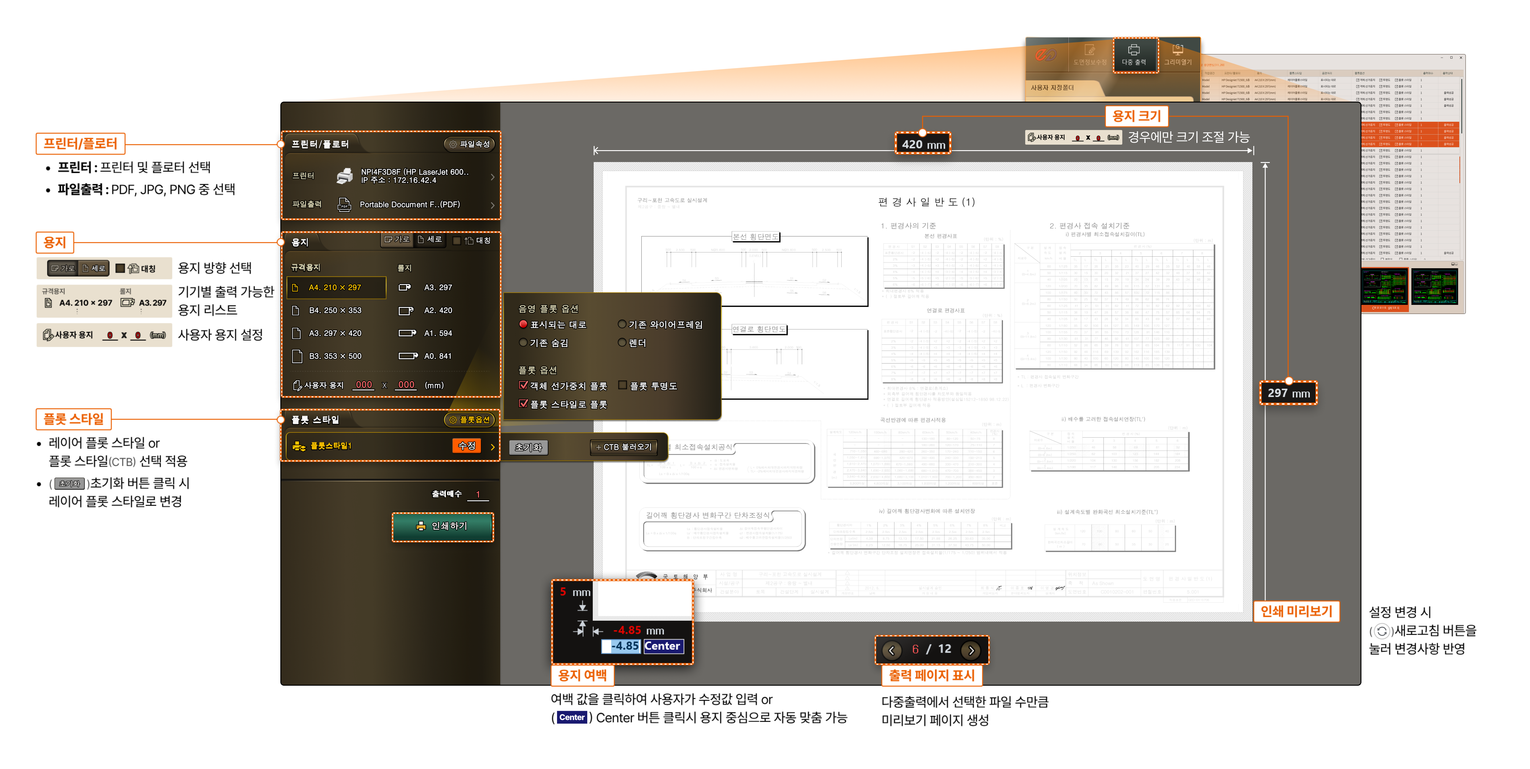 - 출력영역을 도곽맞춤 선택 후 전체출력 체크 시 페이지 수 표시