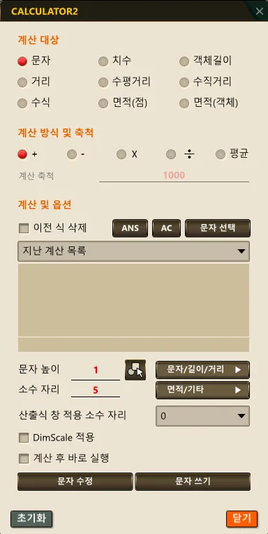 • 도면 내 문자, 거리, 면적, 수식 등의 값을 계산하거나 변환하고 그 결과를 즉시 텍스트로 작성 또는 수정할 수 있는 고급 계산기 기능입니다.