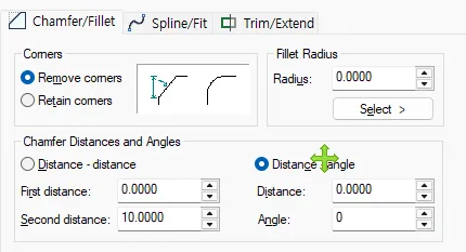 • Distance-angle: 하나의 꼭짓점에 연결된 한 변의 길이를 정하고 그 변에서 다른 변까지의 각을 설정해 모따기를 실행합니다.