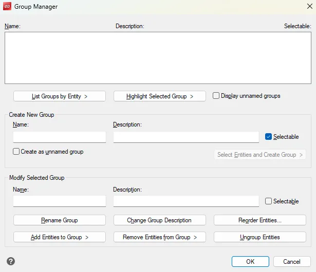 - 도면 내 그룹을 생성, 수정, 관리할 수 있는 그룹 관리자 대화상자를 여는 기능입니다.