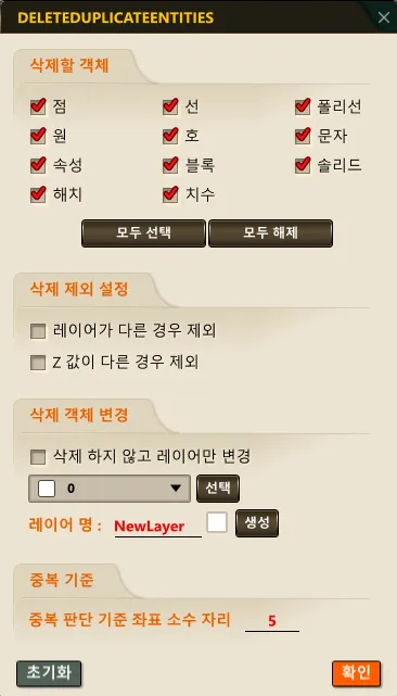 • 도면에서 중복된 객체를 자동으로 찾아서 삭제하거나 하나로 정리하는 기능입니다.