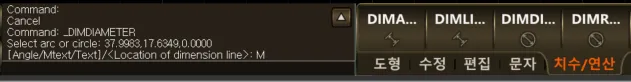 섹션 제목: “2. 지름 치수 문자의 각도 변경 시연 영상”1) DIMDIAMETER 명령을 실행하고, 도면에 지름을 측정할 원 또는 호를 선택합니다.