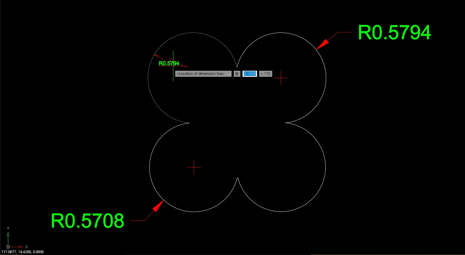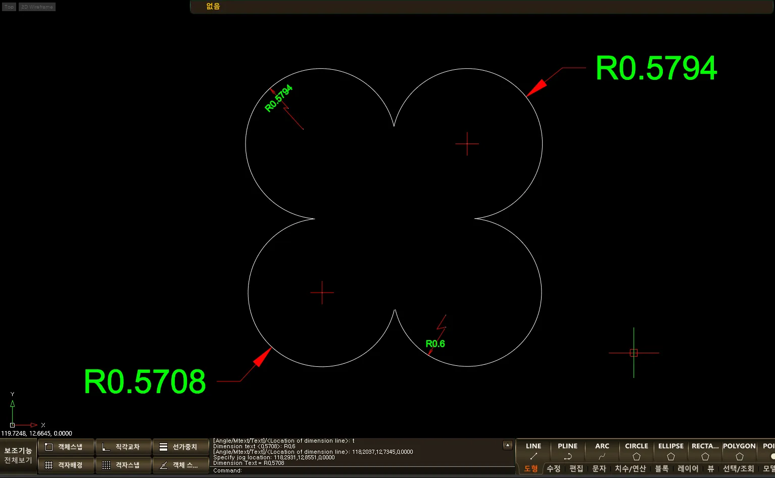 - 선택한 원 또는 호의 반지름을 측정하여 꺽어진 치수로 표시합니다.