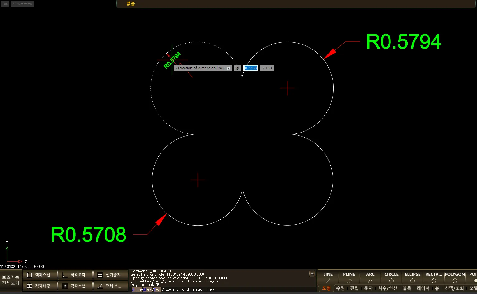 2. 꺽은선 반지름 치수 문자의 각도 변경 시연 영상