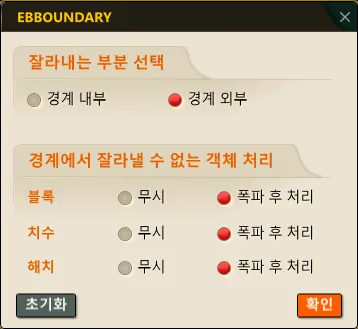 - 경계 외부 : 선택한 객체를 기준으로 외부 영역의 선을 잘라냅니다.