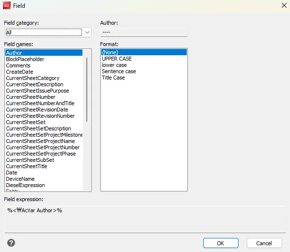 - 필드 이름 : 선택한 카테고리 안의 세부 항목 지정 (예: 작성자, 도면 이름, 객체 길이 등)