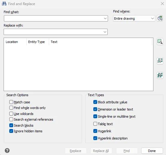 • 검색 범위 : 현재 도면 전체, 선택 영역, 특정 객체 유형 등 지정 가능
