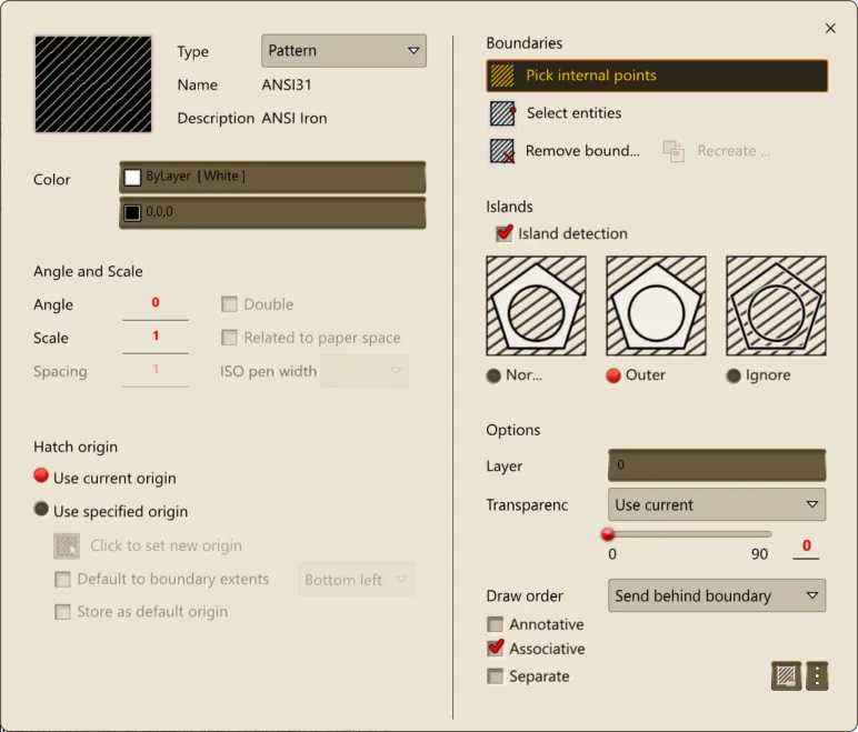 • Hatch Origin 항목을 통해 해치패턴의 시작점을 지정할 수 있습니다.