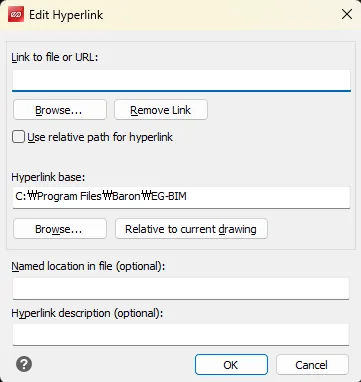 • 객체에 외부 웹사이트, 파일, 전자우편 주소 또는 같은 도면 내 특정 뷰로 연결되는 하이퍼링크를 삽입하는 기능입니다.