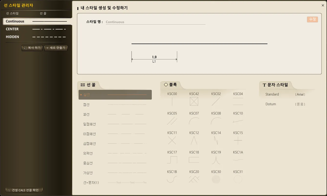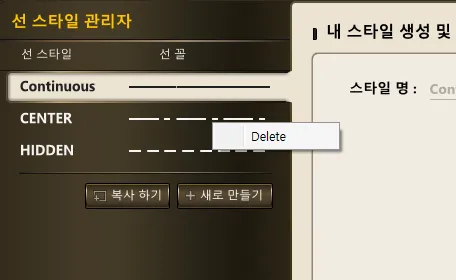 선스타일 관리자는 좌측에 선 스타일 목록과 우측에 선 스타일 편집화면으로 구성되어 있습니다.