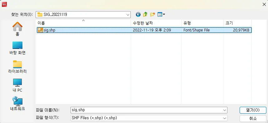 2) 가져올 GIS 데이터 파일(SHP, SDF, SQLite 등)을 선택합니다.