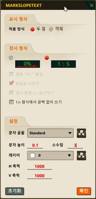 2) 팝업창에서, 적용방식, 경사 표시 형식, 경사도 문자 크기 등을 설정하고, ‘확인’ 을 클릭합니다.