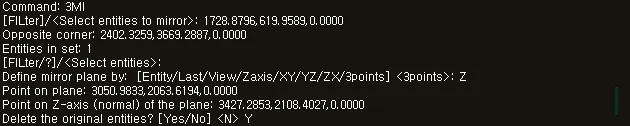 섹션 제목: “1. 객체 3D 대칭 복사 시연 영상”1) “MIRROR3D” 또는 “3MI” 명령어를 실행합니다.