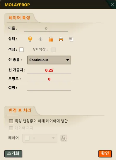 3) MOLAYPROP 대화상자에서 변경할 레이어 속성을 지정합니다.