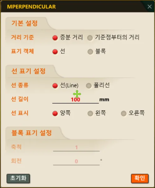 • 명령어 옵션 팝업창에서 “확인” 버튼을 누르면 옵션이 저장되고 수직선 넣기 동작이 시작됩니다.