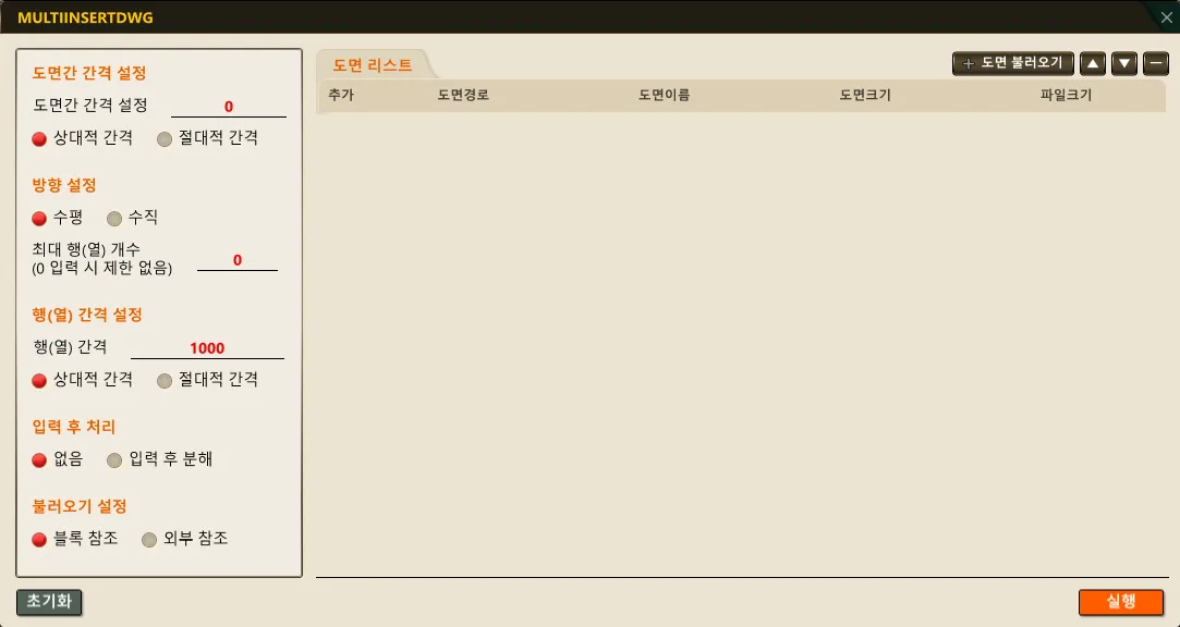 - 여러 개의 DWG 도면을 한 번에 불러와 블록(Block) 형식으로 도면 공간에 일정한 간격으로 자동 배치하는 명령어입니다.