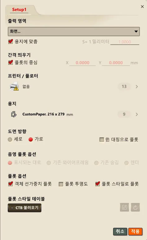 4) 인쇄 환경(프린터, 용지 크기, 플롯 영역, 배율, 스타일 테이블 등)을 설정합니다.
