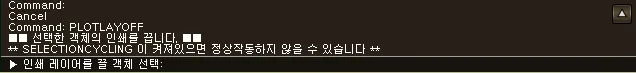 섹션 제목: “1. 레이어 출력 제외하기 시연 영상”1) 명령창에 “PLOTLAYOFF” 명령어를 입력합니다.