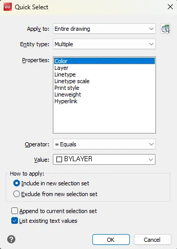 - 도면에서 특정 조건(예: 레이어, 색상, 객체 종류 등)을 기준으로 객체를 빠르게 선택 하는 기능입니다.