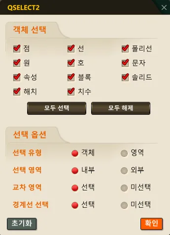 - 도면에서 객체 종류와 선택 규칙(영역/교차/경계선) 을 한꺼번에 지정해 해당 조건에 맞는 객체만 빠르게 선택하는 고급 “빠른 선택” 도구입니다.