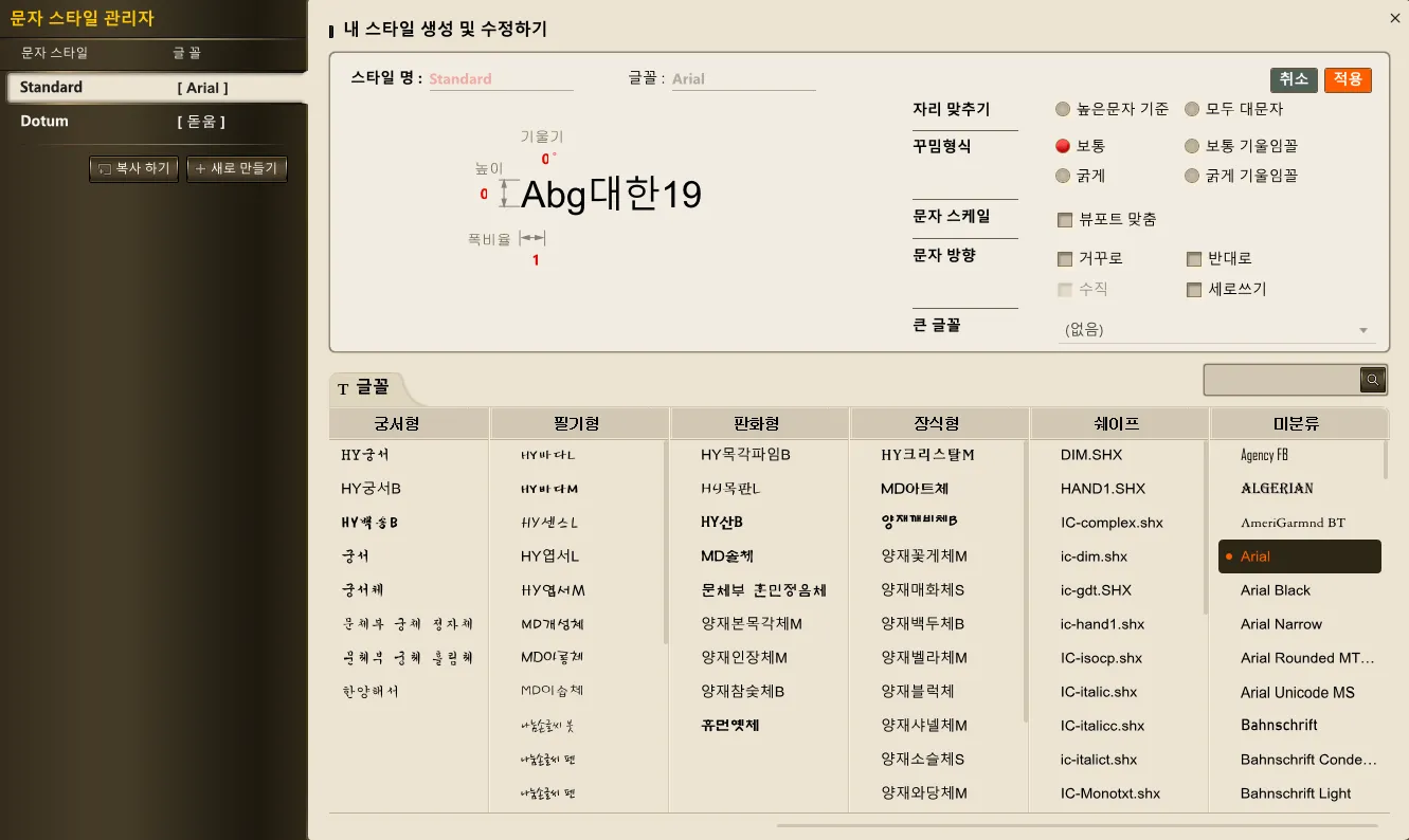 - 도면에서 사용할 문자 스타일을 생성, 수정, 관리하는 기능입니다.
