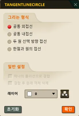 - 원(Circle) 또는 두 원 간의 공통 접선을 자동으로 생성하는 기능입니다.
