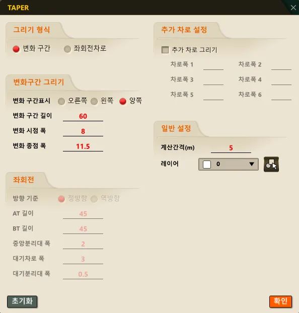 - 도로 테이퍼(Taper, 완화 구간) 를 자동으로 생성하는 명령어입니다.
