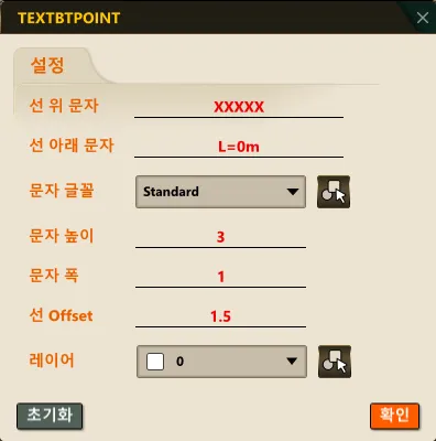 • 선택한 객체에 두 점을 지정하여 선(Line)과 그 위·아래 텍스트를 자동으로 배치하는 기능입니다.
