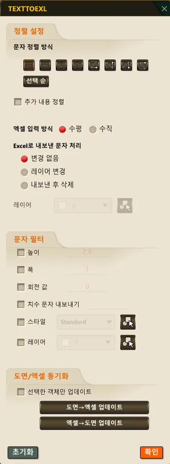 - 도면 내의 문자 객체를 추출하여 엑셀 파일로 내보내는 기능입니다.